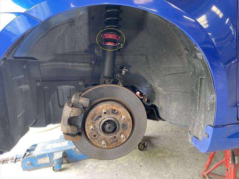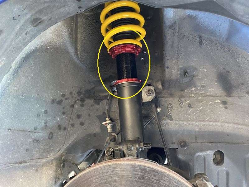 車高調は全長式ですが調整式のピロアッパーに交換すると厚みがあるため車高があがってしまいます。