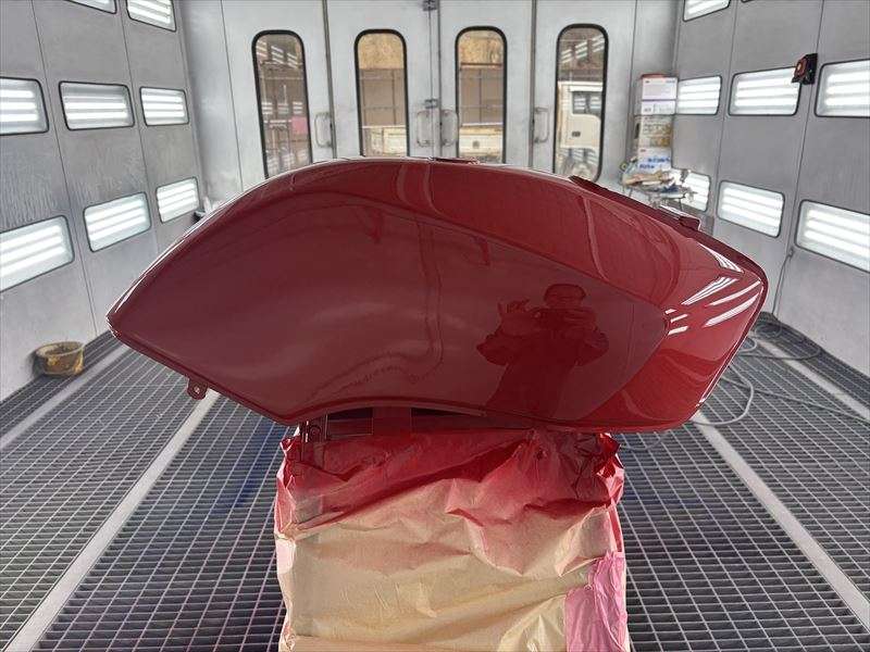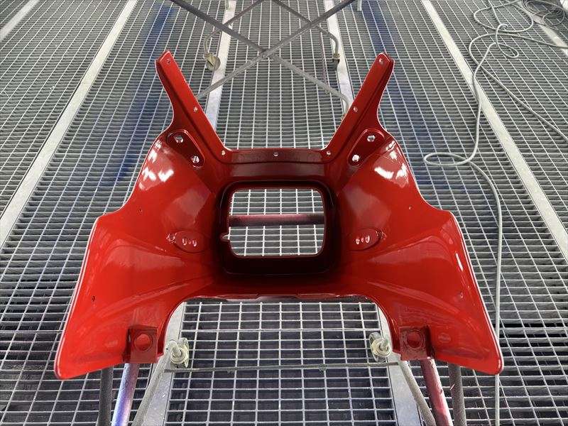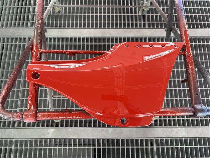 長年の使用により退色・ひび割れが目立っていたタンク・サイドカバー・テールカウルを、 ウレタン塗装で純正カラーにリペイントしました。